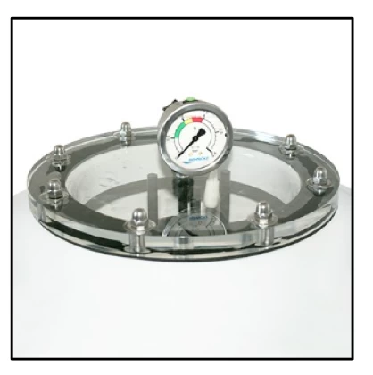 - Doorzichtig boven deksel voorzien van een manometer en manuele ontluchter.