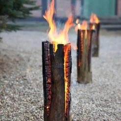 Zweedse boomstam fakkels zijn niet alleen de blikvanger op uw tuinfeest maar geven bovendien warmte en sfeervol licht. Het dennenhout zorgt voor een mooie verticale verbranding door de speciale gleuven en specifieke luchttoevoer. De Zweedse fakkels vonden hun oorsprong in de 30 jarige oorlog van 1618 tot 1648. Toen werden deze houten kaarsen gebruikt door de Zweedse soldaten. Deze boomstam fakkels lieten hen toe om vers gekapte dennenbomen toch goed te laten branden.