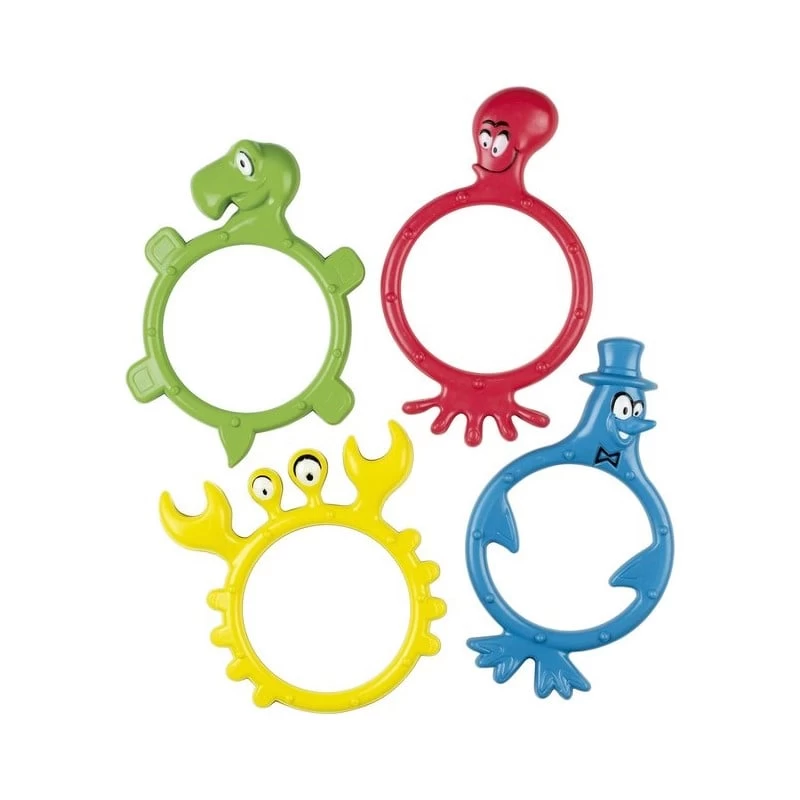 Duikstokjes BECO set 4 stuks, met dieren figuren. Geschikt om kinderen spelenderwijs te leren duiking in het zwembad. De stokjes zinken naar de bodem.