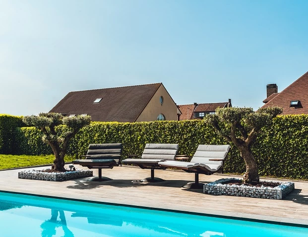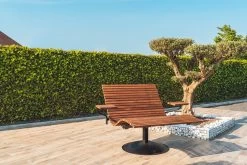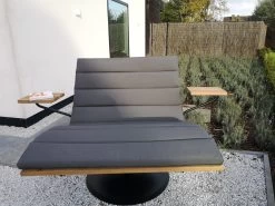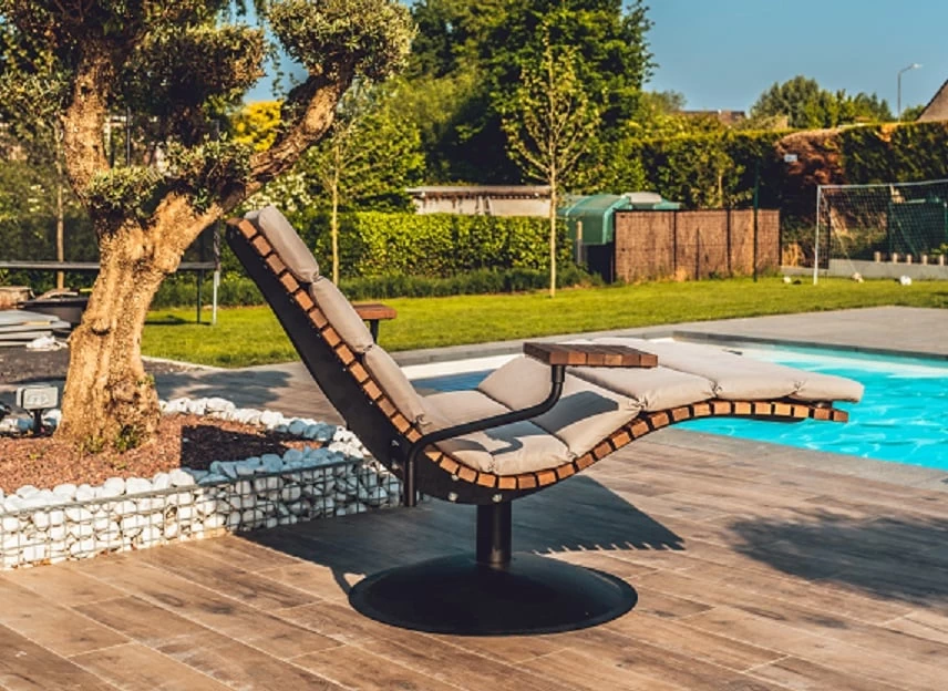 De Lazy Daisy lounger heeft een stevige metalen voet, kan ronddraaien en is perfect gemaakt om te laten buiten staan. Optioneel kan je links en rechts een beweegbaar klein tafeltje mee bestellen, ideaal om een drankje of boek op te leggen.