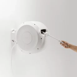 Mirtoon kan 180 graden draaien en plat tegen de muur worden geplaatst. De waterslang van 30m rolt zacht en vlot terug op wanneer je die terug wil opbergen. Er is ook een variant met een haspel met wieltjes de Tasman, eveneens in het wit of zwart als u liever een mobiele tuinslang wenst.