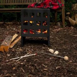 Moderne vuurkorf vierkant model met grote gaten. Klein vuurkorfje als gezellige en sfeervolle vuur in de tuin of op terras. Kan eenvoudig opgeborgen worden. De vuurkorf zit verpakt in een brandbaar krat. De vuurmand heeft 2 handige handvaten om te kunnen verplaatsen. Het is een zeer licht en klein model en kan dus gemakkelijk opgeborgen worden.