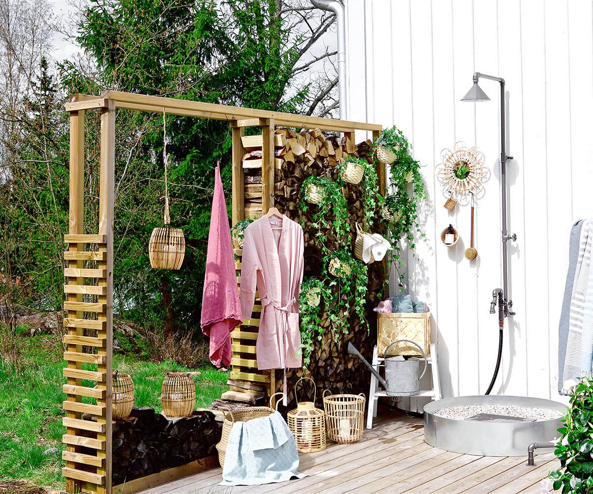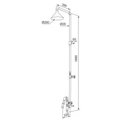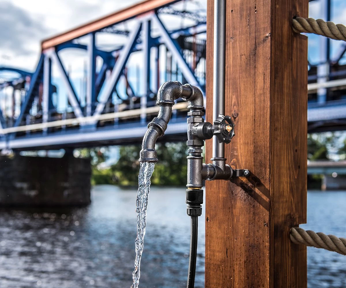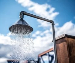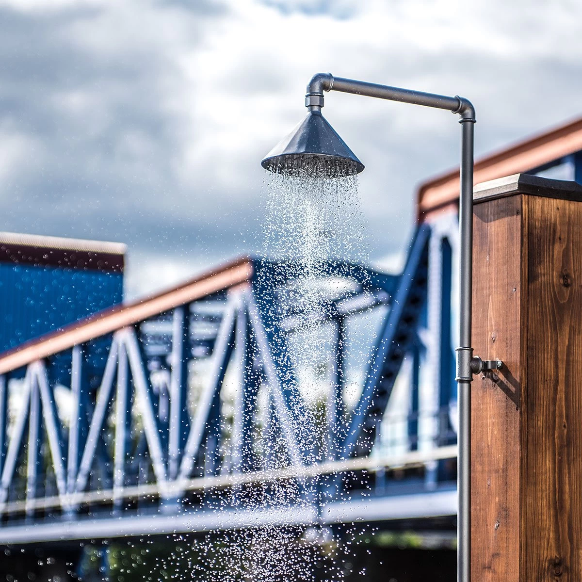 Tuindouche met industriële en brute look. Kan eenvoudig gemonteerd worden tegen de wand van een Poolhouse, aan een boomstam of bv aan een balk in de grond. De bediening is eenvoudig met een bolkraan. Met een hendel kan je het water sturen naar de douche of de voet kraan.