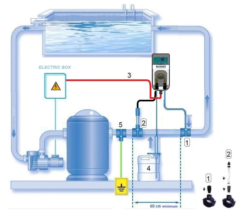 We adviseren om de dosering van het zuur (ph Min) NA de zandfilter en NA de verwarming (warmtepomp of warmtewisselaar) te installeren. Dit omwille van het feit dat ph min (zuur) het vuil op de zandfilter kan losmaken, waarna het in het zwembad terecht komt. Dit zal troebel water veroorzaken. Ook de warmte bron kan aangetast worden als u het zuur doseert voor de verwarming. ALGEMENE REGEL dus dosering zo dicht mogelijk bij het zwembad, na de technische installatie van het zwembad. Gebruik bij voorkeur zwavelzuur en geen zoutzuur. Zoutzuur geeft  dampen af die alle metaal onderdelen in de technische ruimte aantast.