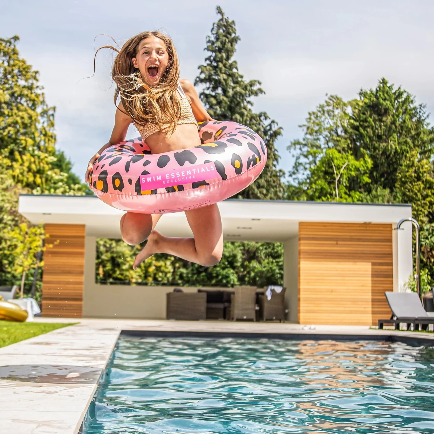 Roze panter zwemband 90 en 70 cm diameter. Drijvende opblaasbare zwemband voor groot en klein met gold rosé panter print. Voor kinderen vanaf 6 jaar.
