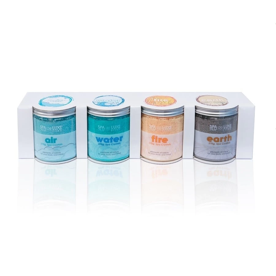 Badzoutpakket ideaal als geschenkidee, wordt geleverd in een mooie verpakking. De 4 geuren verwijzen naar de 4 elementen, lucht water, vuur en aarde. Zout heeft de eigenschap de huid extra te gaan verzorgen en voeden. Het zeezout is dus zeer zacht voor de bader. De heerlijke geur zorgt bovendien voor een relaxerend effect.