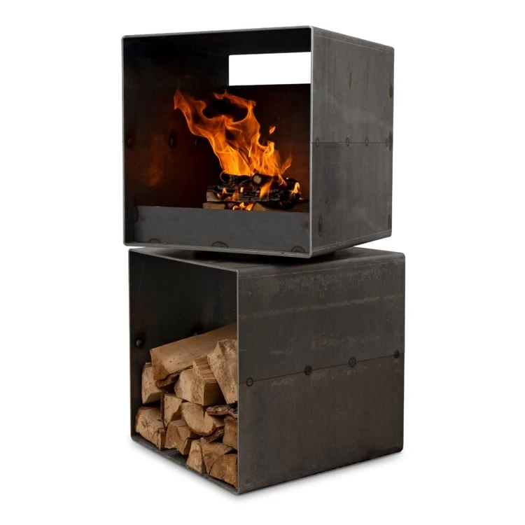 Square 85 Tuinhaard met draaiend bovenstuk, opslagruimte onder de haard voor het opbergen van hout. Modern design vervaardigd in hoogwaardig staal. In het kachelstuk zijn de hitte stenen inbegrepen.