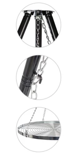 Deze driepoot is handig bij de Salo vuurschaal. Deze vuurschaal is verkrijgbaar in 60cm en 80 cm diameter. De verchroomde gril rooster hangt aan vast met een stevige ketting, in hoogte verstelbaar. Klaar met eten en BBQ’en, dan kan je de statief barbecue tripod wegnemen en de vuurschaal heerlijk opstoken voor een gezellige lange avond aan het kampvuur.
