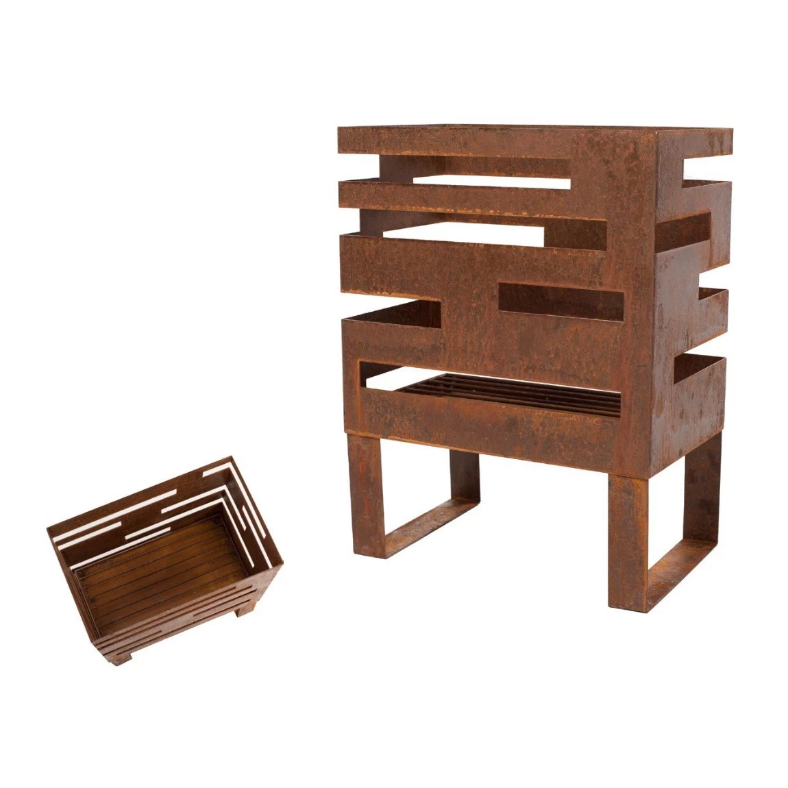 Moderne vuurkorf Madison in geroest staal materiaal van 1,8mm dik met afmetingen 38 x 23 x 50 cm en een gewicht van 5.2 kg