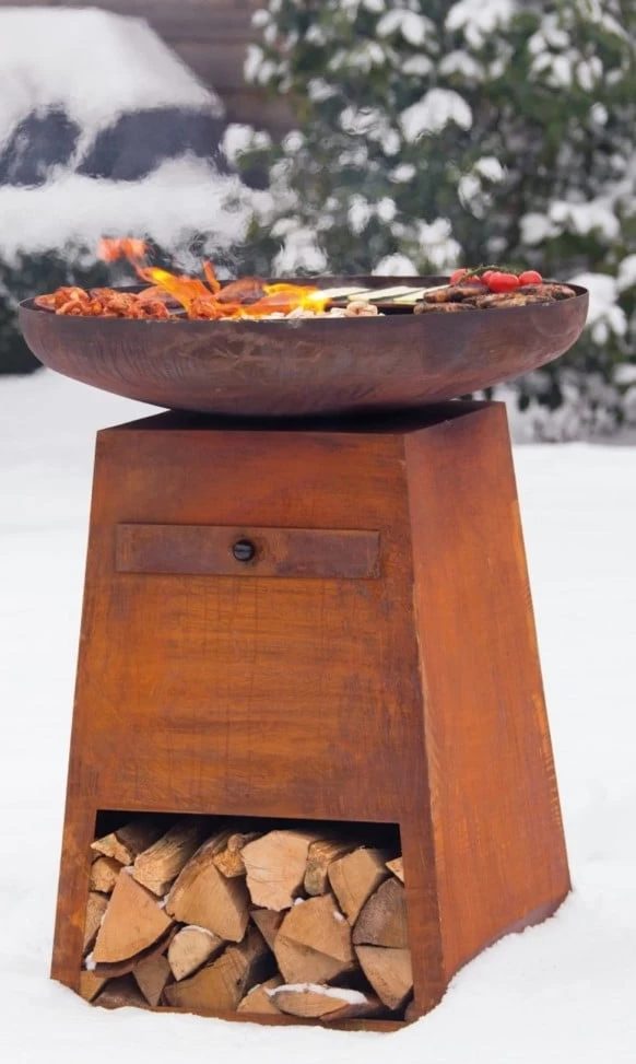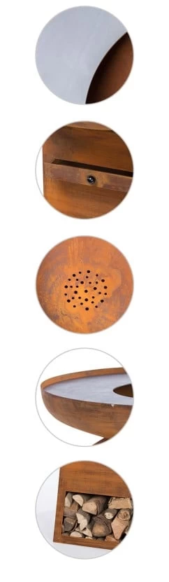 Doordat de vuurschaal op een werkhoogte staat is dit zeer handig in gebruik. Bijkomend is er onderaan een ruimte voorzien voor het stockeren van het hout. Zo hebt u steeds droog BBQ hout bij de hand.