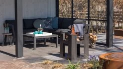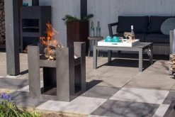 Vuurkorf hollola met moderne look in staal met een kleine hout opslag, onder het houtvuur. Gemaakt van 2mm staal 50cm x 50cm x 60cm hoog. Brede en hoge vuurkorf ideaal voor meerdere blokken hout en een stevig vuur.