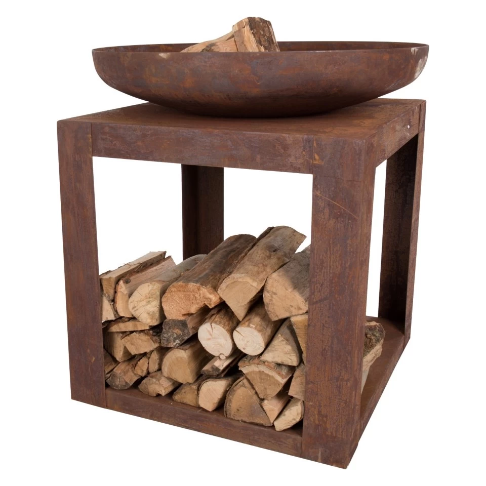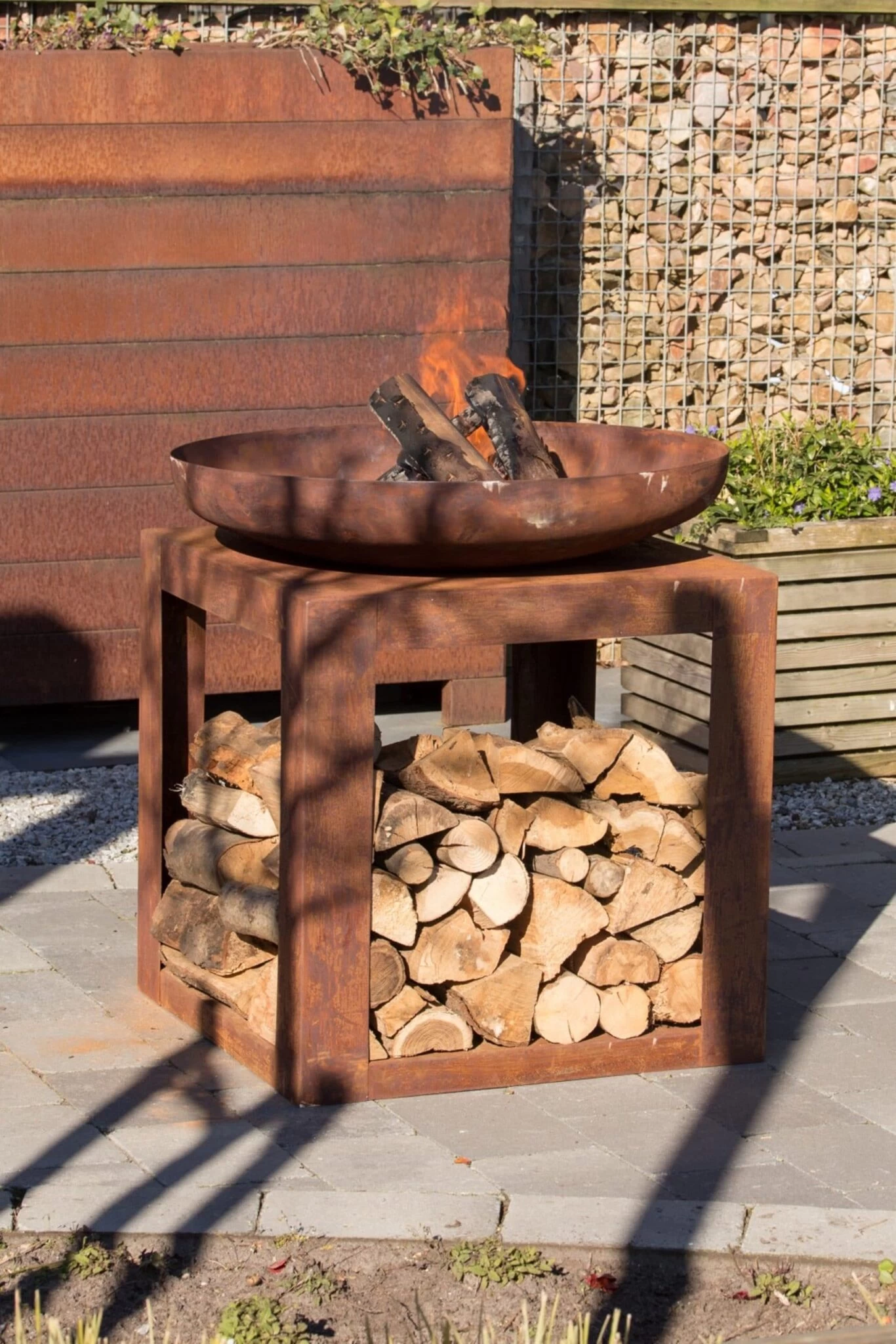Vuurschaal Firepit Selki met een houtopslag onder de vuurschaal. 80 x 80 x 85 cm. Roest staal materiaal van 2 mm dik.
