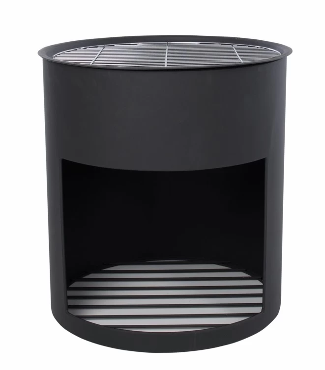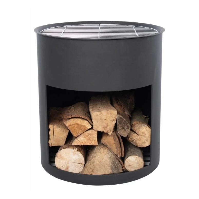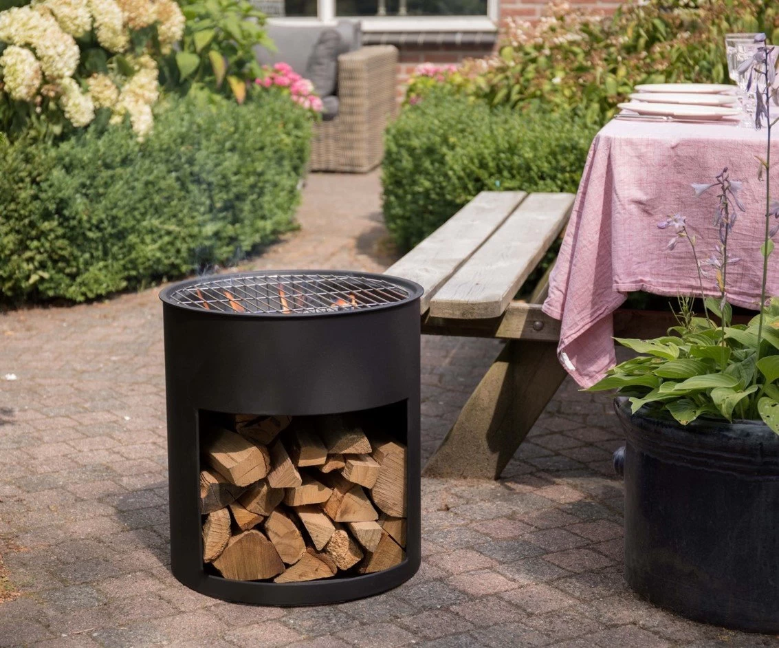 Vuurton met rooster voor BBQ en een houtopslag onder het vuur. De diameter is 45cm de hoogte 49cm. Gemaakt van zwart staal 0,8mm dik.