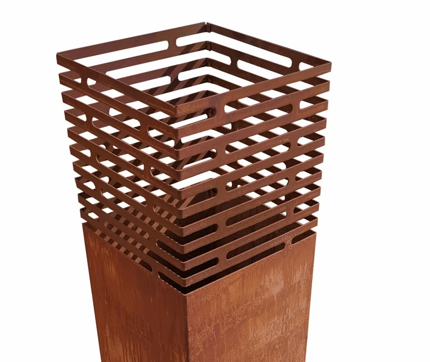 Deze stalen zuil krijgt een natuurlijke look door het roesten doorheen de tijd. Bijkomend kan deze gebruikt worden om vuur in te maken met enkele blokken berkenhout. Daarnaast wordt de design vuur toorts gebruikt als houder voor Finse – of Zweedse fakkels. Dit zijn houtblokken die van binnenuit in brand gestoken worden.