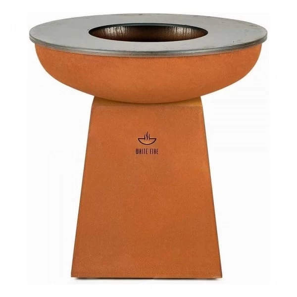 De barbecue is rondvormig en staat op een voetstuk. Je kan de barbecue schaal vullen met houtskool of houtblokken waardoor je het kan gebruiken als vuurschaal, maar het bijzondere aan deze schaal is de brede rand die je kan gebruiken als grillplaat om lekker op te koken.
